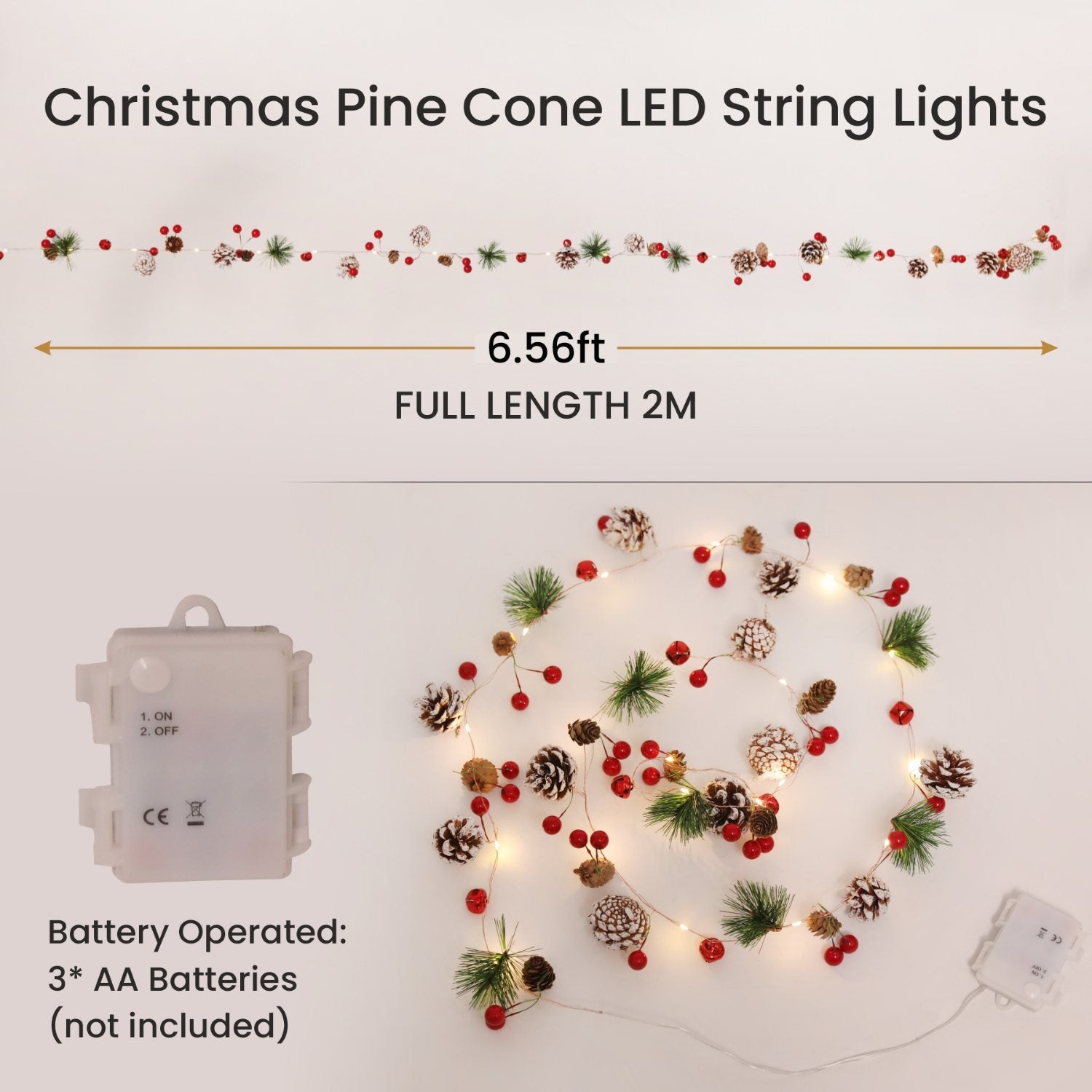 Olsen & Smith Set of 2 x 2m Pre-Decorated Christmas Garland with LED String Lights – Pine Cones, Red Berries, Pine Needles & Bells – Battery Operated Xmas Fairy Lights for Home, Mantel & Table Décor