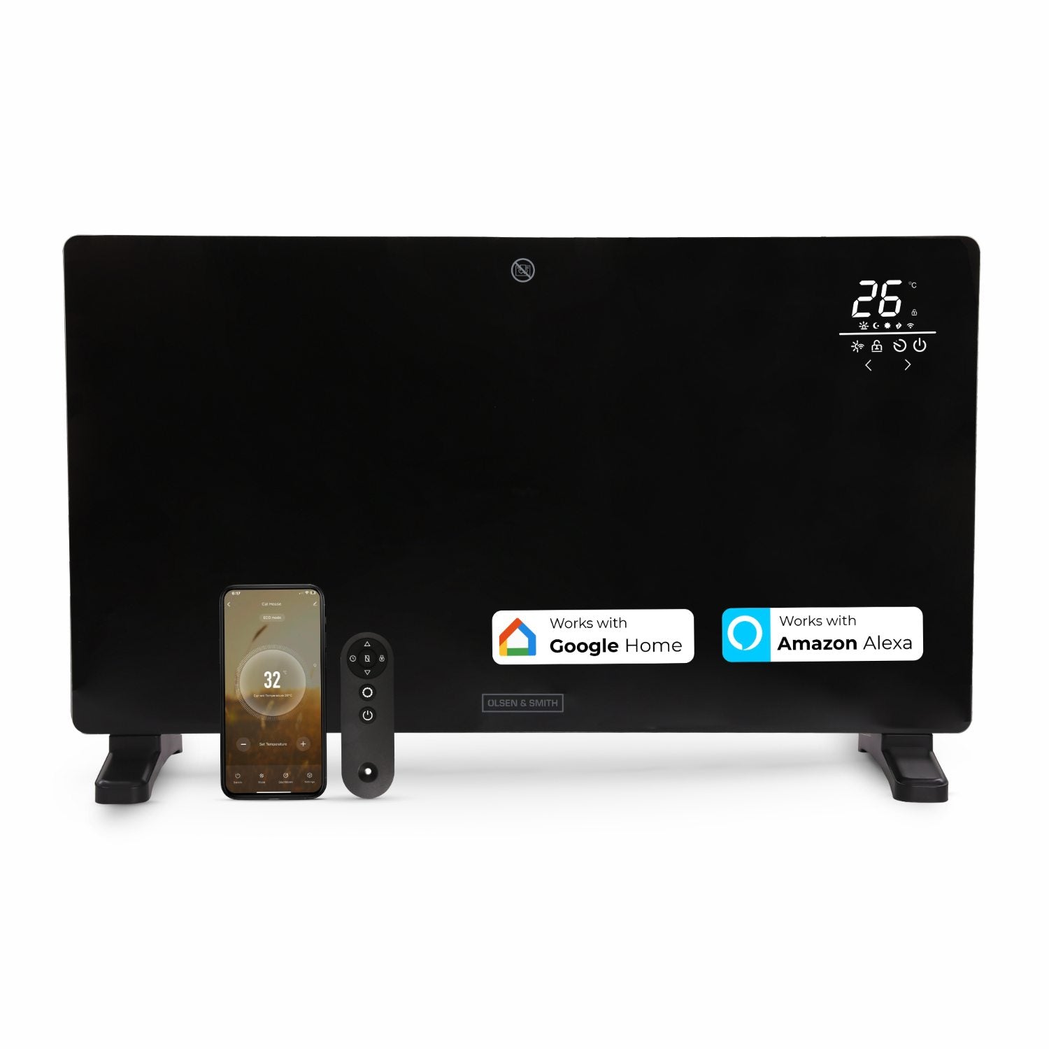 Olsen & Smith 2500W Wi-Fi Enabled Smart Glass Panel Electric Heater – Alexa Control Radiator with Thermostat, Timer, Wall Mounted or Freestanding, Ultra Slim Design, Energy Efficient Home Heating - Black