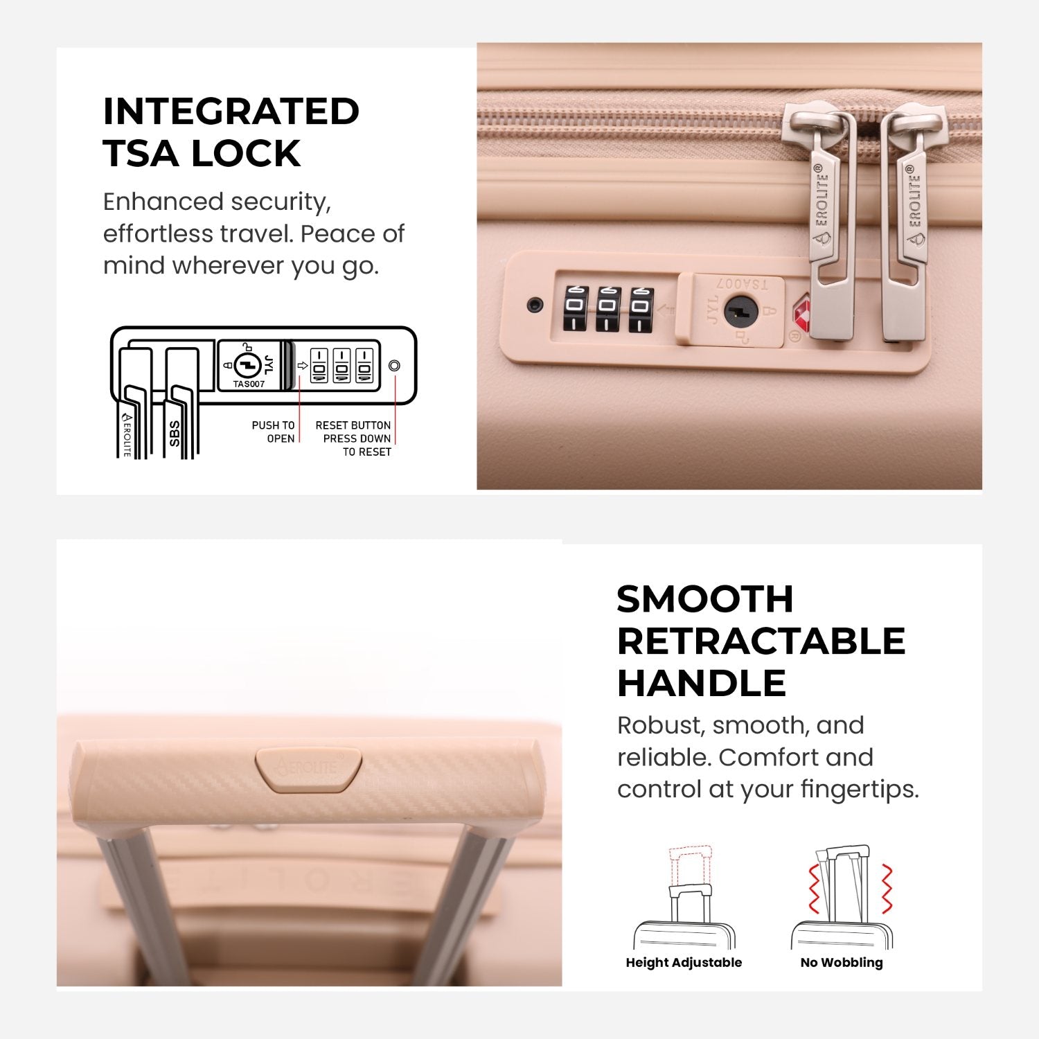 - Retractable Telescopic Handle – Adjustable height handle provides comfort while travelling and allows small bags to rest securely on top.