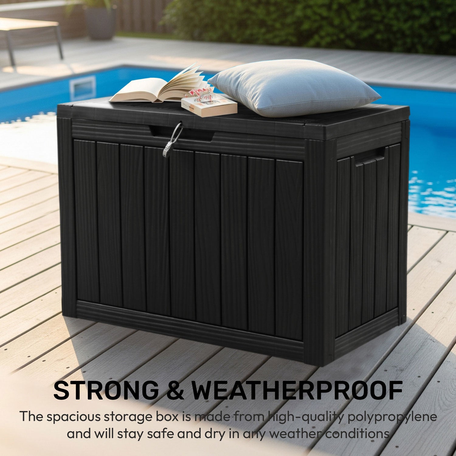 - Product Specifications – External Dimensions: 78 x 43 x 56 cm (L x W x H) | Capacity: 170 litres | Weight: 4.8kg | Finish: Stylish black wood-effect design to complement any garden or patio décor.