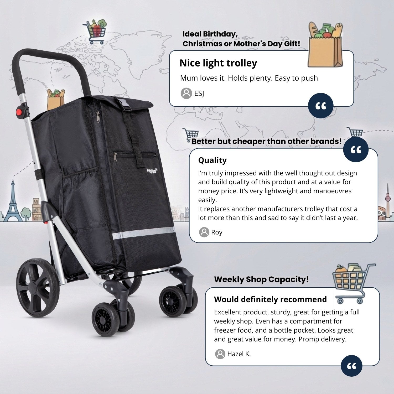 Available in an array of designs and colours, whether you're young or old, you'll enjoy the extended shopping stamina you get from shopping with a Hoppa!