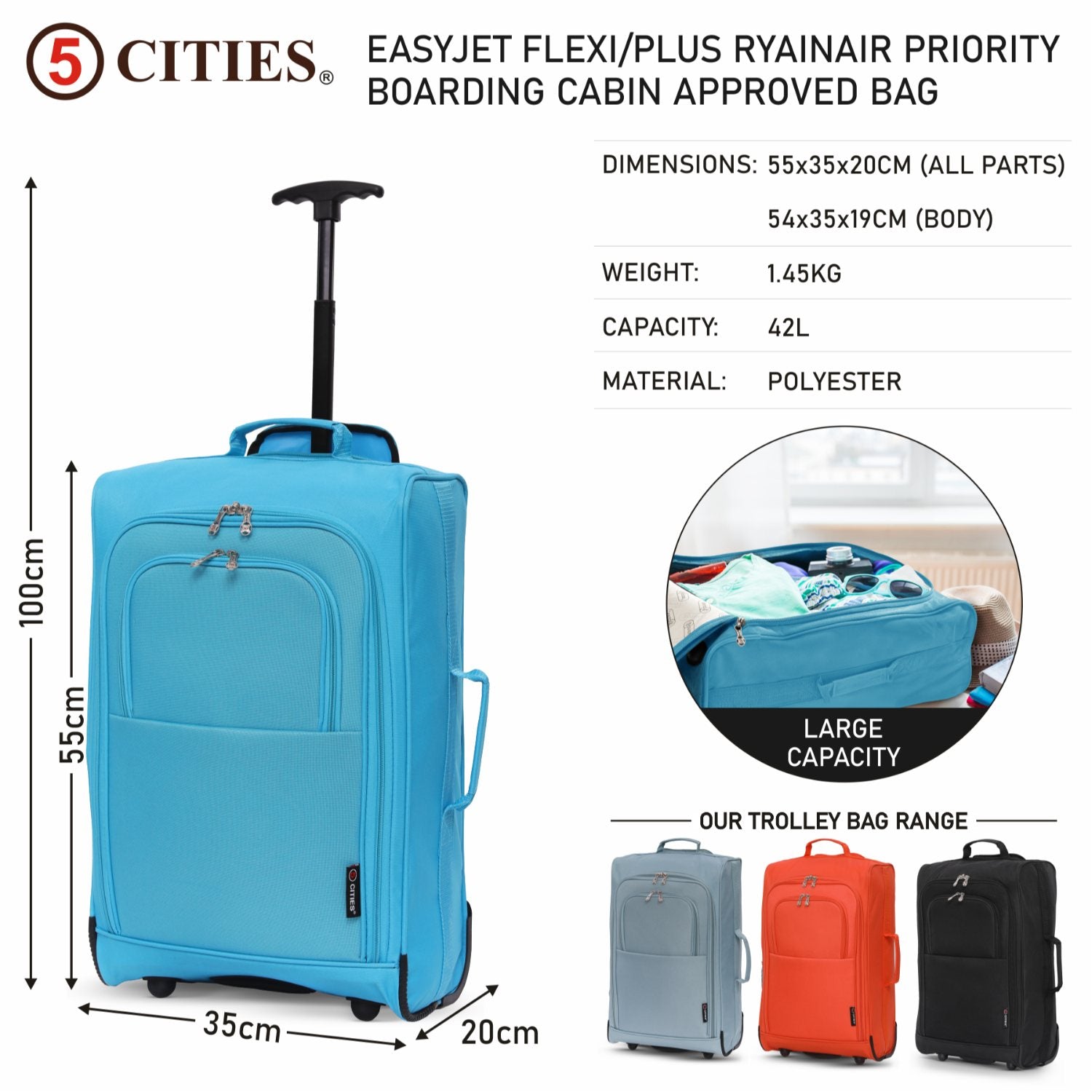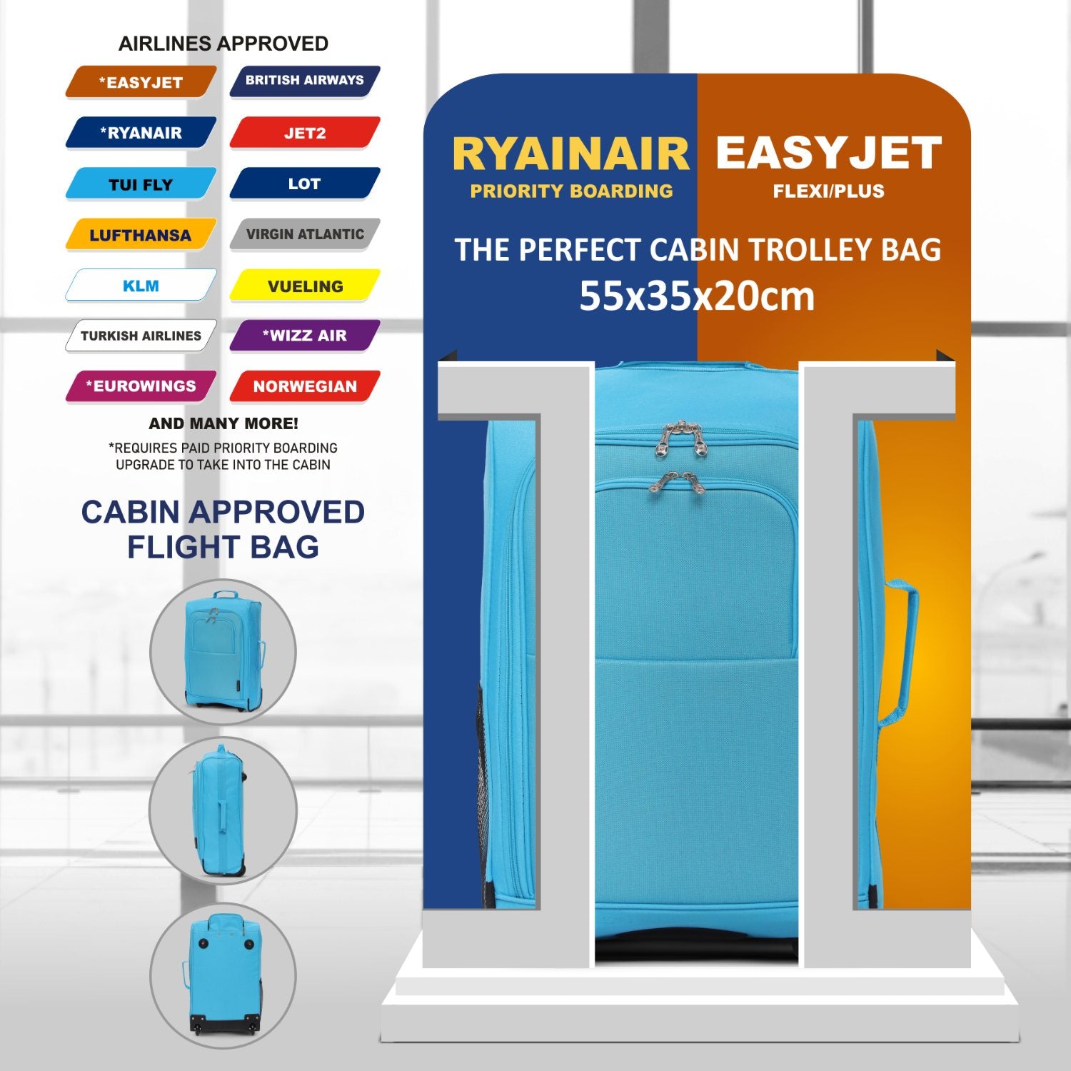 This lightweight trolley bag fits within the 55x40x20 & 56x45x25cm cabin approved hand luggage for Ryanair (Priority Boarding if you have purchased Priority & 2 Cabin Bags), EasyJet , BA, Virgin, Flybe & others whilst the holdall is designed for Ryanair's maximum free carry on hand luggage allowance.