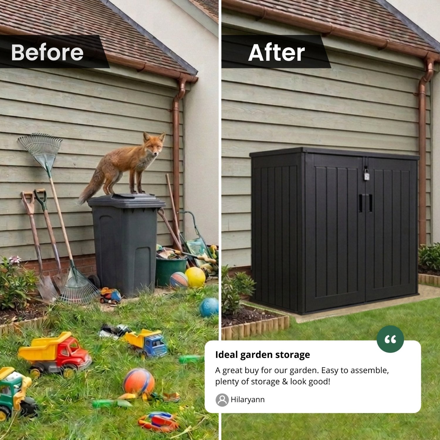 The perfect outdoor storage box for your garden tools and equipment, wheelie bins, and accessories. The big lockable box will keep all your items safe and protected.
