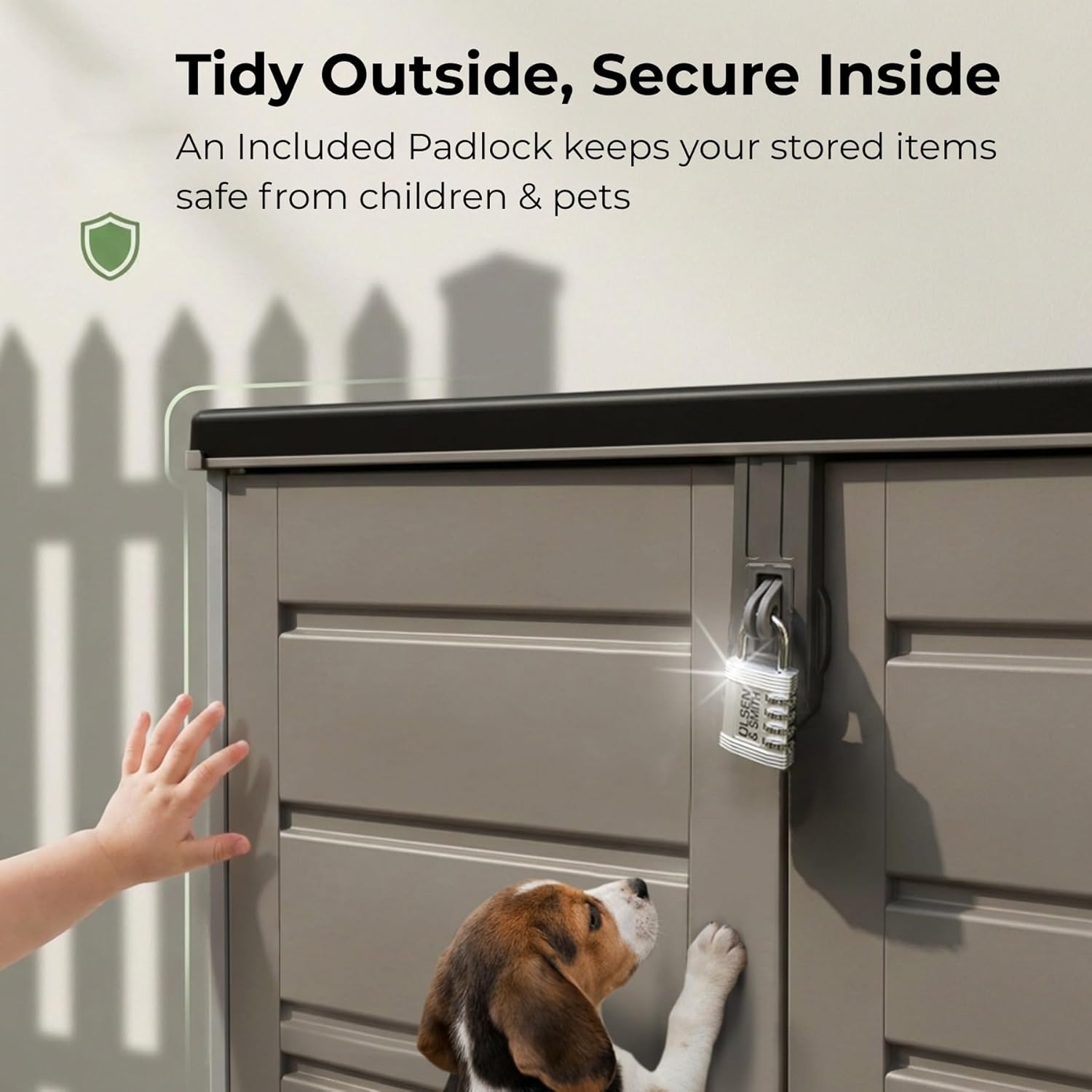 - FRONT-OPENING DOUBLE DOORS WITH PADLOCK INCLUDED: Unlike standard storage boxes, this unit opens from the front with two wide doors for full, unrestricted access to the entire interior. Comes with a secure padlock included. Ideal as a lockable outdoor cupboard, tool store or bin enclosure.